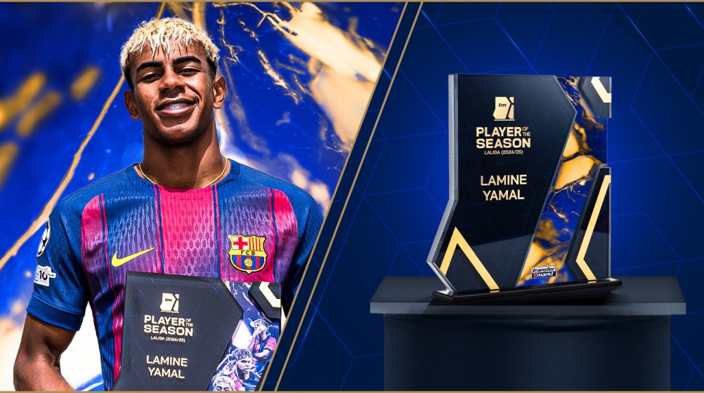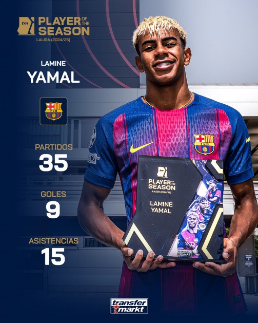 北京时间9月12日,据德国转会市场官方消息,巴萨边锋亚马尔获评德转上赛季西甲赛季最佳球员,该奖项由用户投票选出。